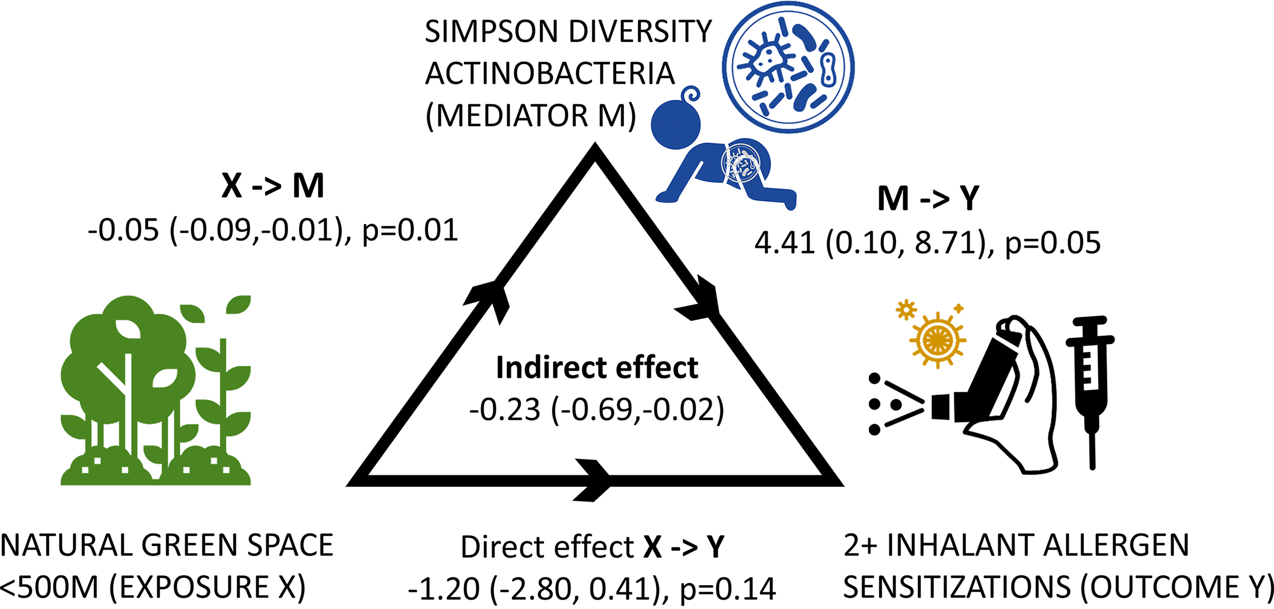 Mediation of natural space <500m from residence and ≥2 inhalant atopic sensitizations at 3 years via Simpson diversity of Actinobacteria at 4 months. Beta estimates and 95% confidence intervals presented. 5,000 bootstrap. Acknowledgment of images: Eucalyp, Dima Lagunov, Parkjisun, Blair Adams.